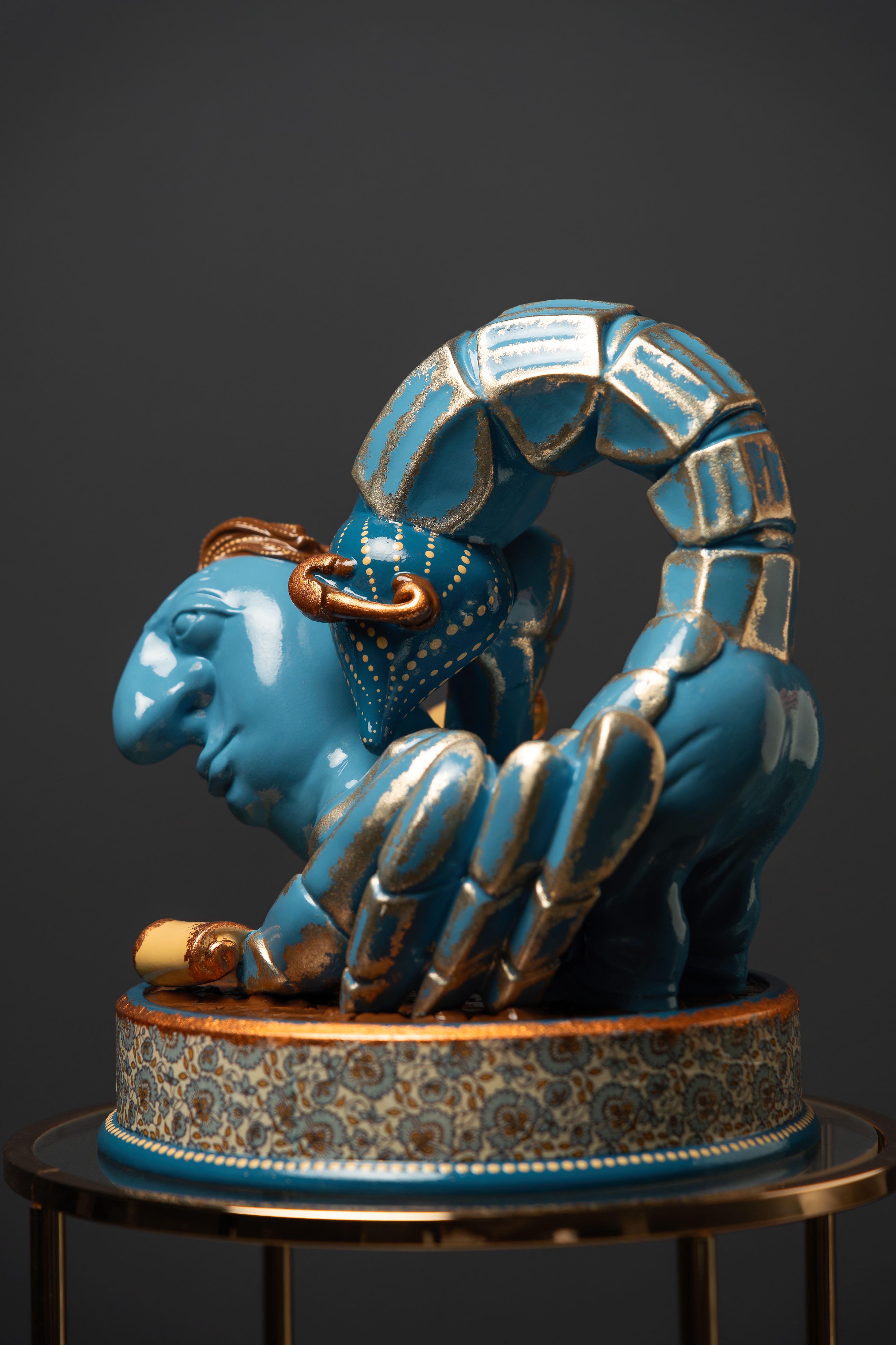 An elegant Scorpio zodiac statuette crafted in deep blue with golden accents. Its unique artistic style highlights the strength, mystery, and individuality of the Scorpio sign. A perfect gift for collectors and anyone born under Scorpio.